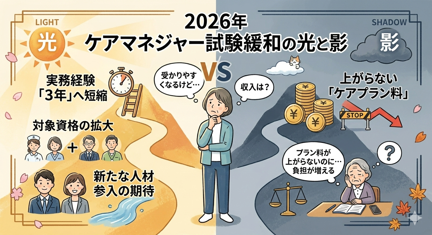 ケアマネ受験緩和の光と、上がらない「プラン料」の影2026年、ケアマネジャーの受験資格は「5年から3年への短縮」や「対象資格の拡大」へと大きく舵を切ります。しかし、現場を熟知する人ほど、このニュースを手放しで喜べないはずです。