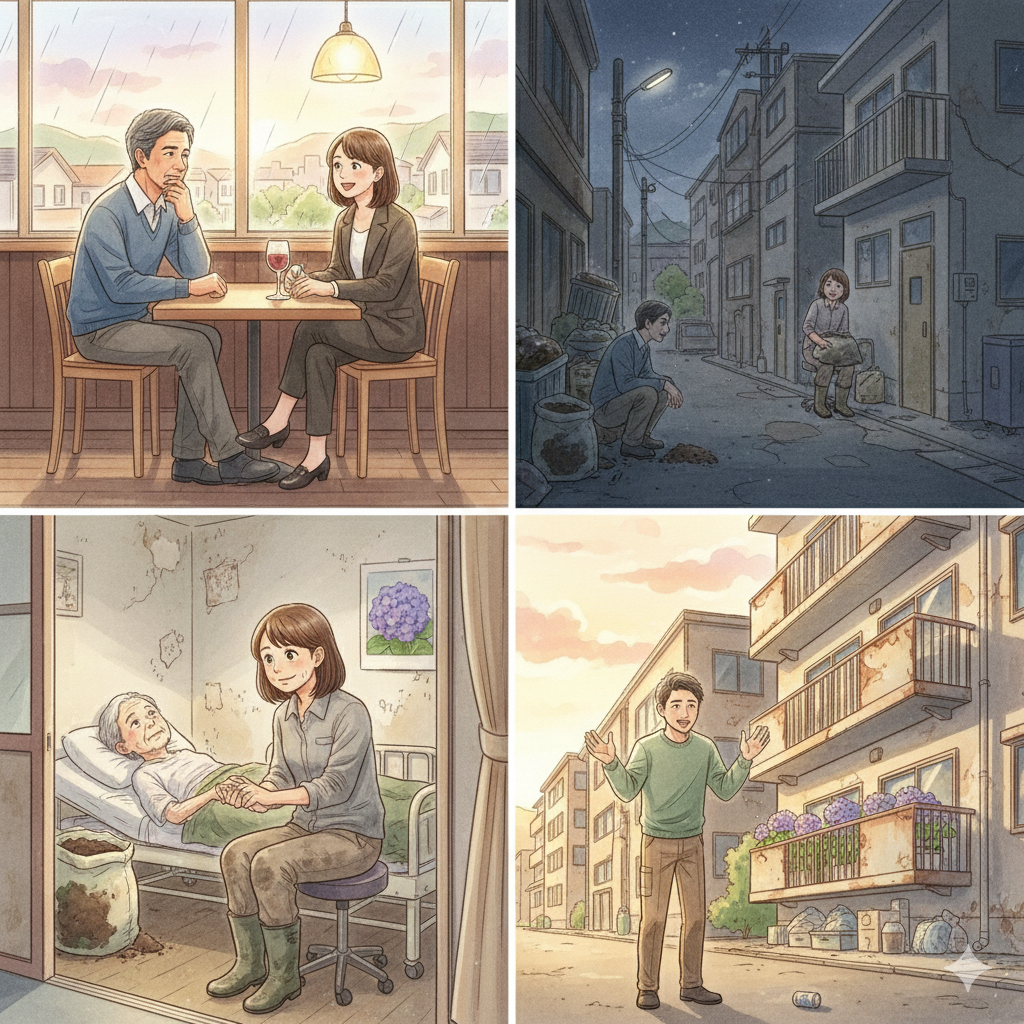 雲の切れ間から、夕日が差し込んだ。錆びついたアパートのベランダが、一瞬だけ黄金色に輝いた。 私は、自分の人生もまだ、捨てたもんじゃないかもしれないな、と思った。少なくとも、この女性の作る庭が花を咲かせるのを、隣で見届けるくらいの未来は、残されているはずだから。